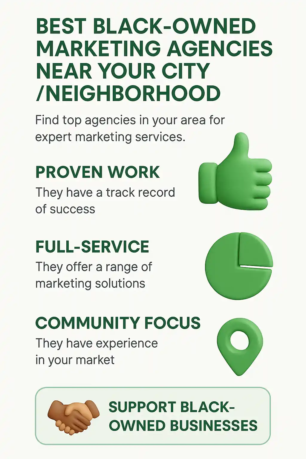 "From our years of working with businesses of all sizes, we’ve seen firsthand that the right marketing partner doesn’t just execute campaigns—it understands your audience, amplifies your brand’s voice, and delivers measurable results. Black‑owned agencies bring perspectives and creativity that consistently turn ideas into impact, and we’re proud to highlight those making a real difference in Your City/Neighborhood."